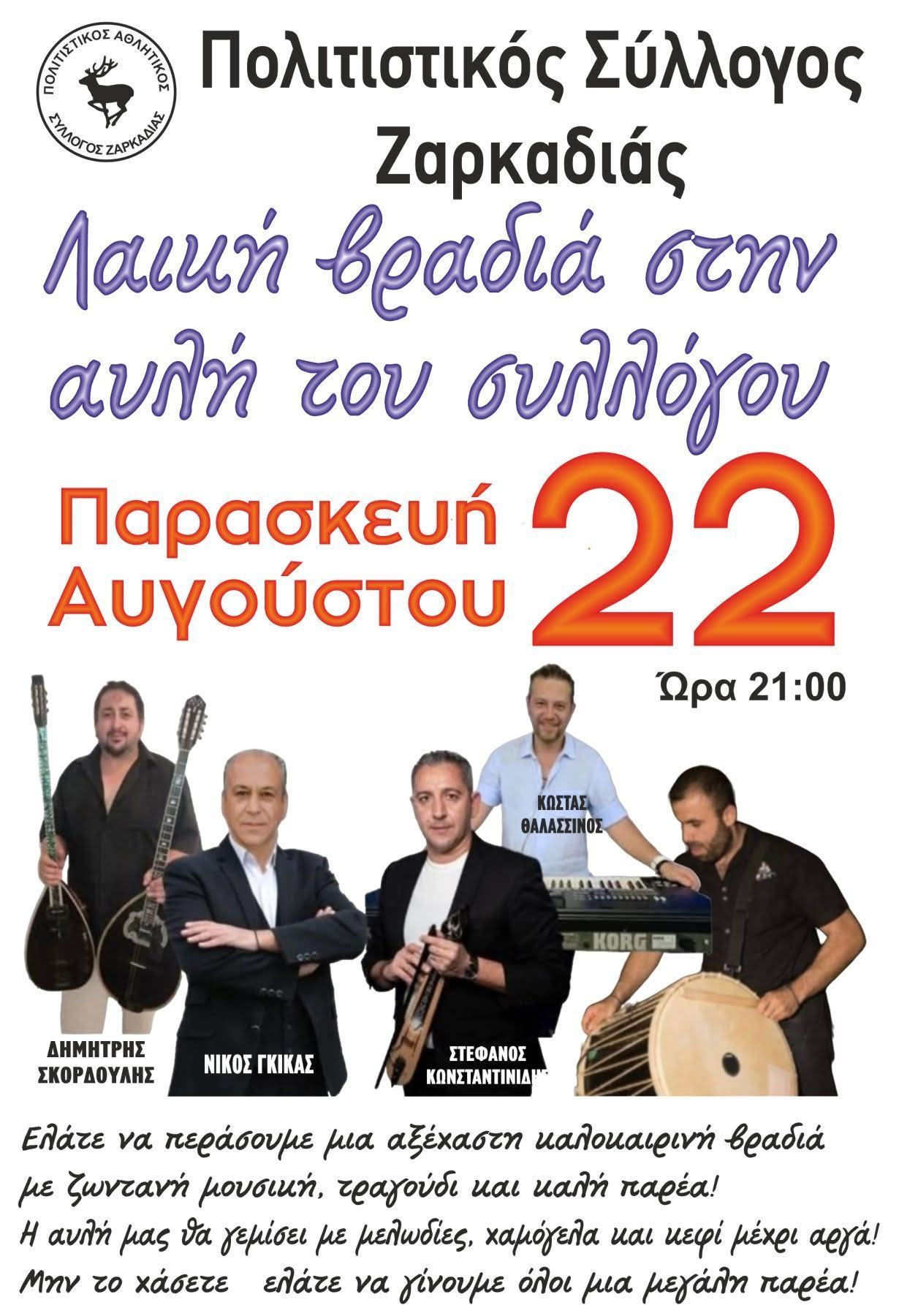 Η Ζαρκαδιά ετοιμάζεται να ζήσει μια από εκείνες τις βραδιές που μένουν στη μνήμη. Την Παρασκευή 22 Αυγούστου, στις 9 το βράδυ, η αυλή του Πολιτιστικού Συλλόγου θα γεμίσει μουσικές, φωνές, χαμόγελα και αγκαλιές.
