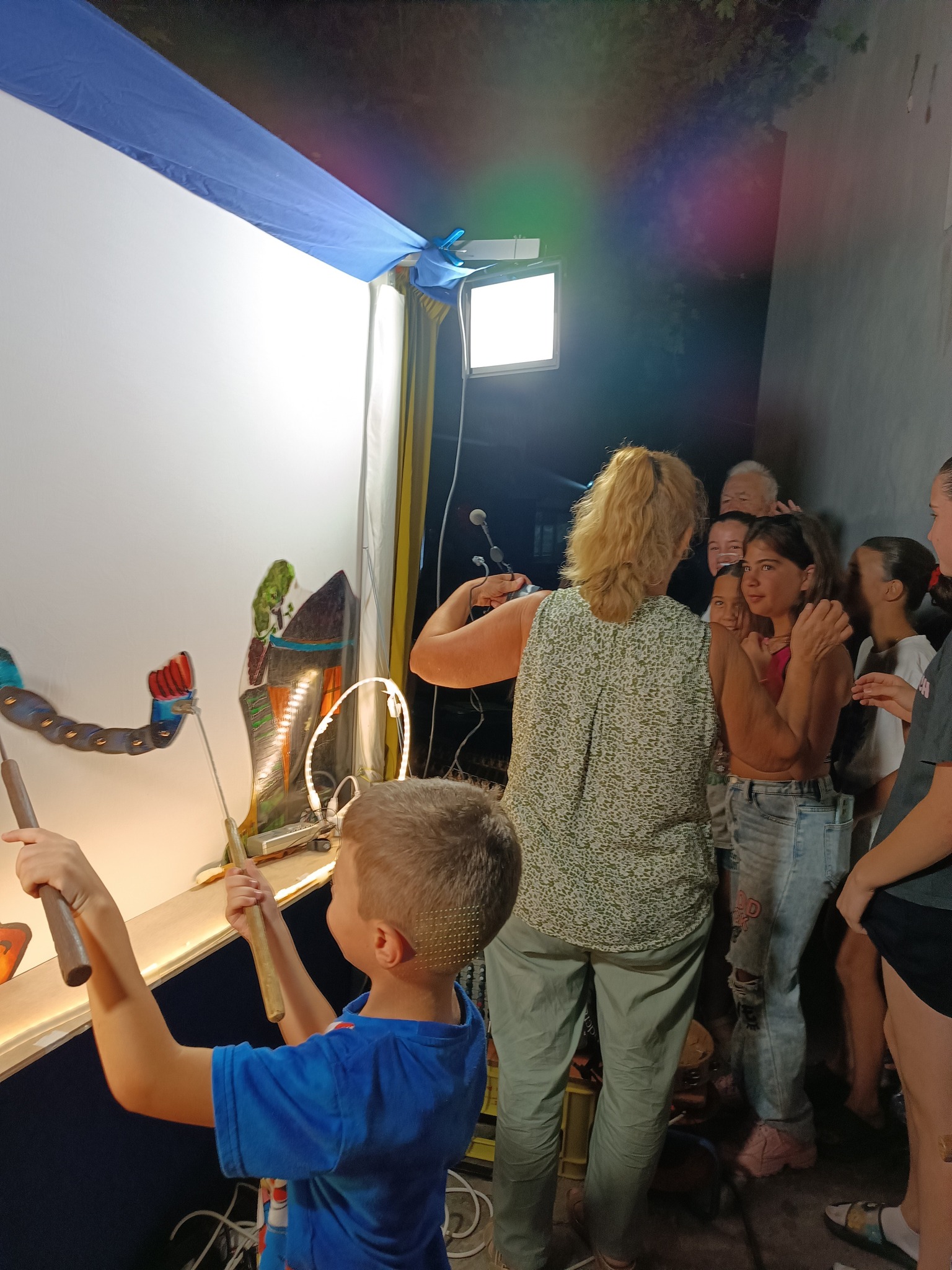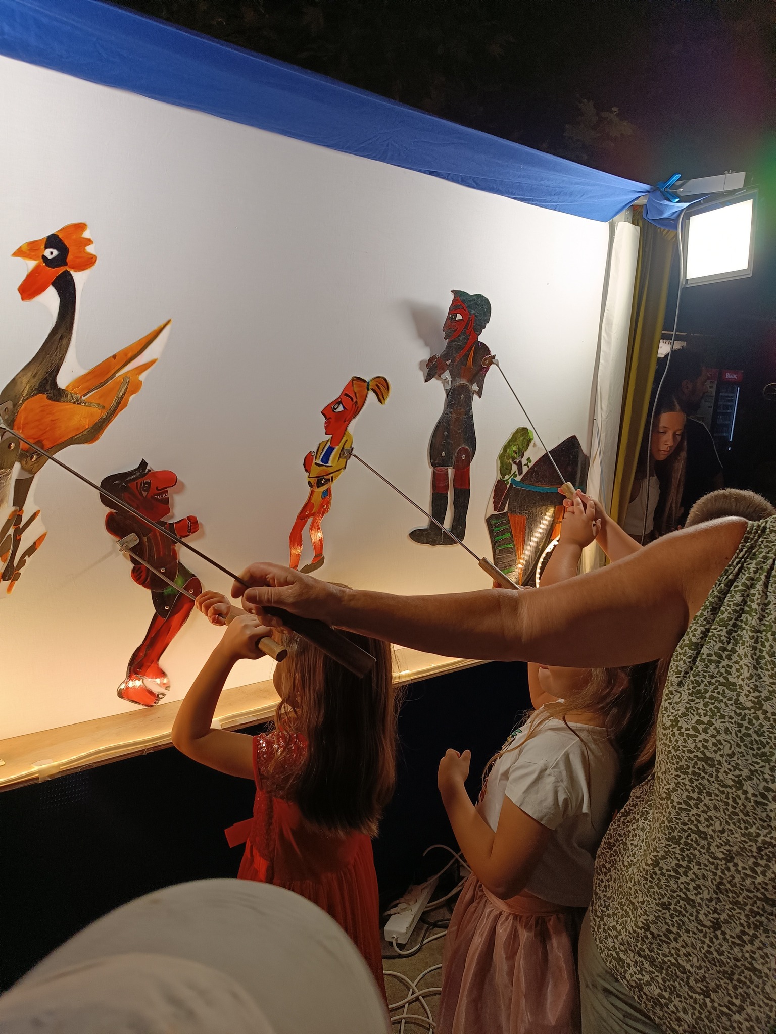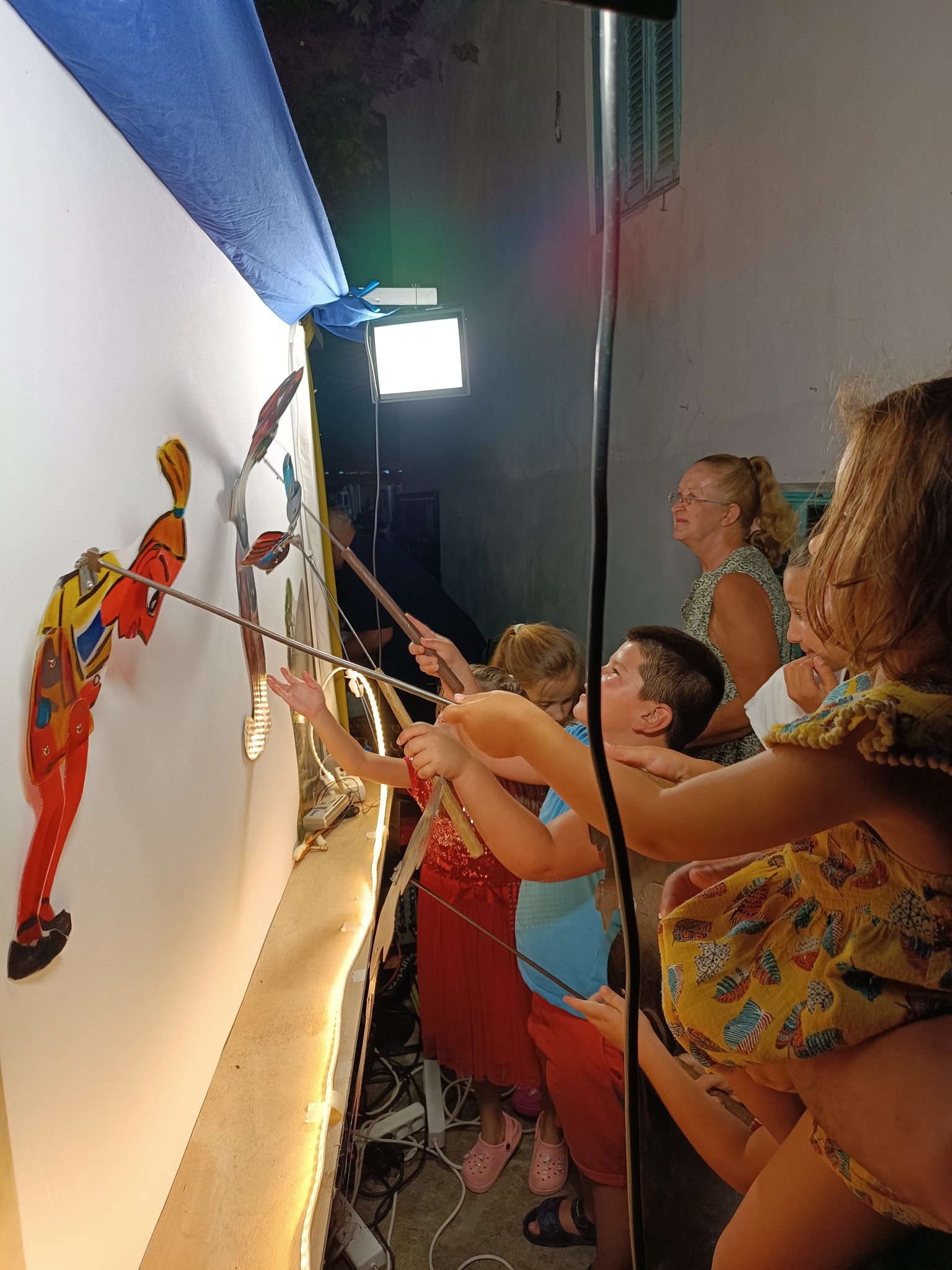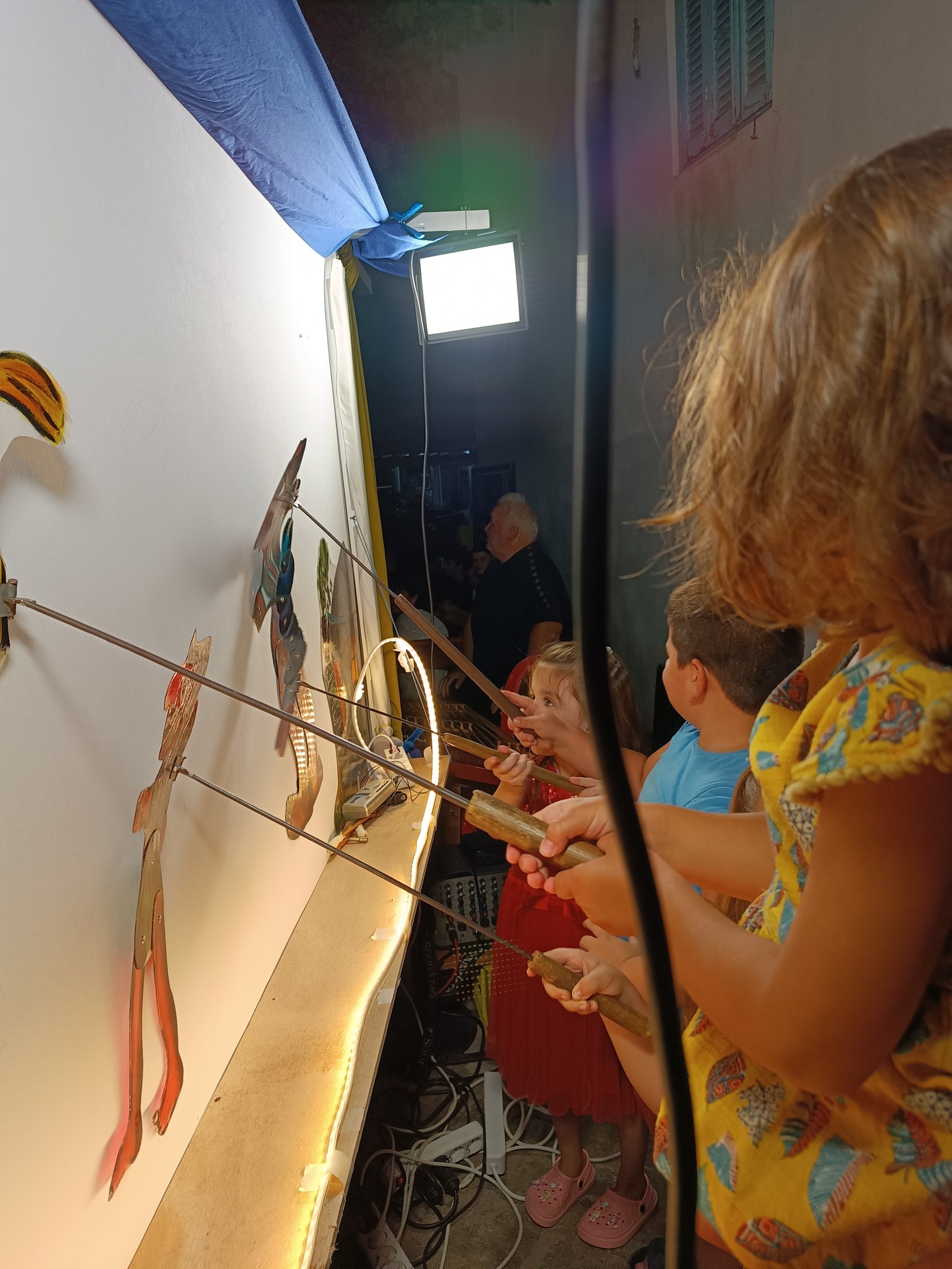 Τα παιδιά ενθουσιάστηκαν∙ δεν έχασαν στιγμή να περάσουν πίσω από τον μπερντέ, να παίξουν με τις φιγούρες, να γνωρίσουν τους ήρωες και να δοκιμάσουν τα μουσικά όργανα του θεάτρου σκιών.